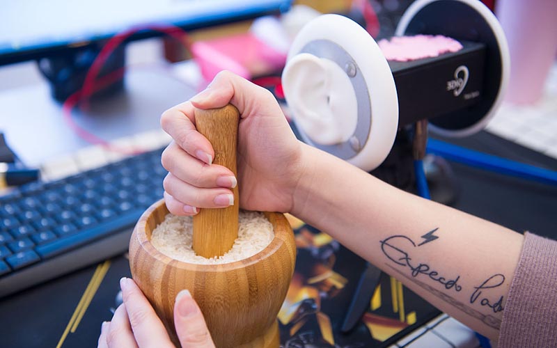 Xiu Weiya, una presentadora ??de transmisión en vivo de ASMR, remueve el arroz para crear un sonido frente al micrófono, en Guangzhou, provincia de Guangdong, el 4 de noviembre de 2017. [Foto / VCG]