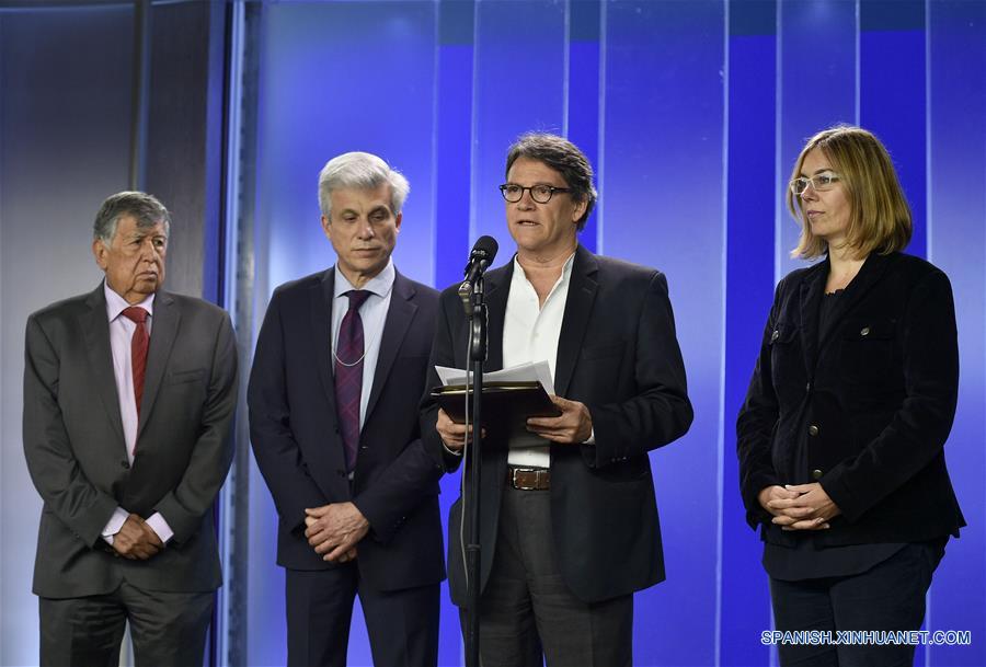 Imagen cedida por la Presidencia de Colombia, del jefe del equipo negociador del gobierno colombiano en los diálogos de paz con el Ejército de Liberación Nacional (ELN), Gustavo Bell (2-d), participando en una conferencia de prensa, en Bogotá, Colombia, el 11 de enero de 2018.(Xinhua/César Carrión/Presidencia de Colombia)