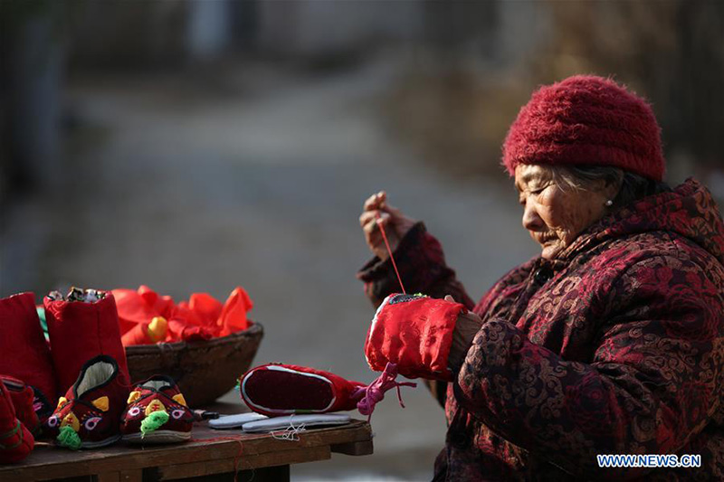 Foto tomada el 24 de diciembre del 2017 que muestra un par de zapatos de cabeza de tigre hechos por el maestro artesado Zhao Kaiying, en Tancheng, Linyi, provincia de Shandong. Los zapatos de cabeza de tigre son un ejemplo de la artesanía popular china tradicional en el calzado para los ni?os. [Foto: Xinhua]