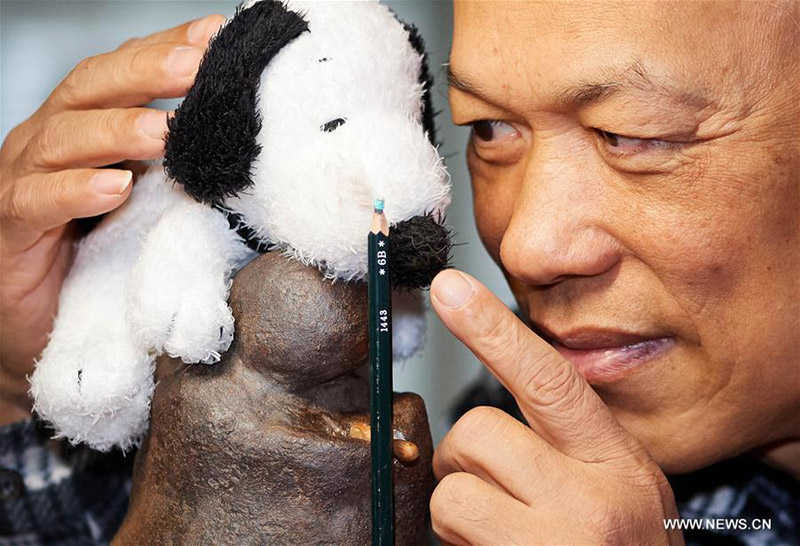 El artista Chen Forng Shean observa su obra en miniatura. En saludo al a?o nuevo chino, este artista taiwanés realizó esta escultura con resinas. El 18 de diciembre del 2017. [Foto: Xinhua]