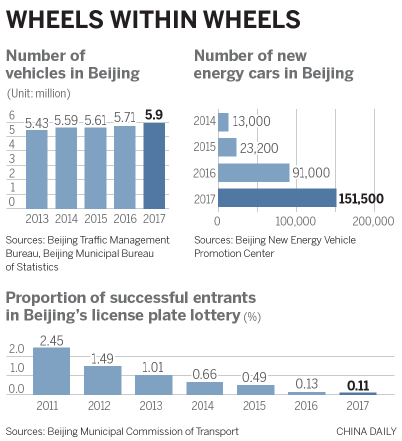 Beijing tiene como objetivo mantener el número total de automóviles en las carreteras por debajo de los 6,3 millones en 2020. A finales de 2017, la ciudad tenía alrededor de 5,9 millones de automóviles. En 2011, cuando se lanzó la política de lotería, el número era de alrededor de 4.98 millones.
