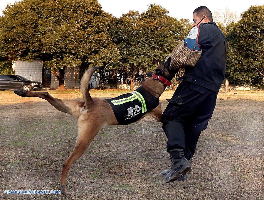 SHANGHAI, enero 14, 2018 (Xinhua) -- Un perro policía recibe entrenamiento para morder, en Shanghai, en el este de China, el 14 de enero de 2018. La décima división del escuadron de investigación criminal de la Oficina de Seguridad Pública de Shanghai tiene más de 100 perros policía. Los perros tuvieron que llevar a cabo entrenamiento diario incluso en el frío invierno, para mantener su memoria y otras habilidades. (Xinhua/Fan Jun)