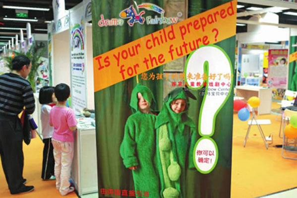Stand de una escuela de teatro para ni?os que contrata a profesores extranjeros para impartir cursos, durante la exposición celebrada en Beijing relacionada con el mercado educativo de etapas tempranas. [Foto: China Daily]