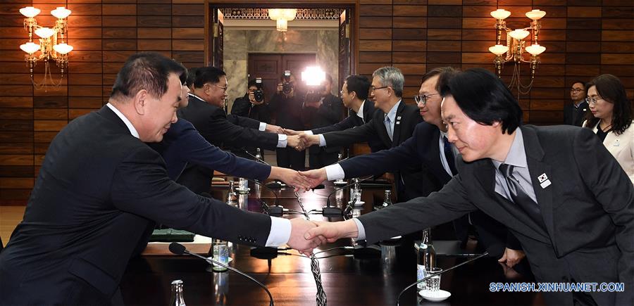 Miembros de la delegación de República de Corea (d) estrechan la mano con miembros de la delegación de la República Popular Democrática de Corea (RPDC), previo a sus conversaciones en la aldea de Panmunjom, el 15 de enero de 2018. (Xinhua/Str)
