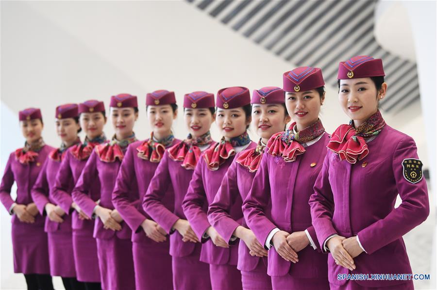 Empleadas del primer tren que comenzará su operación en la vía férrea Chongqing-Guiyang posan en la Estación de Tren Chongqing Oeste, en Chongqing, en el suroeste de China, el 16 de enero de 2017. El ferrocarril Chongqing-Guiyang, de 345 kilómetros y con una velocidad máxima dise?ada de 200 kilómetros por hora, reducirá a unas dos horas el tiempo de viaje medio entre Chongqing y Guiyang, capital de la vecina provincia de Guizhou. En la actualidad el trayecto lleva 10 horas. (Xinhua/Wang Quanchao)