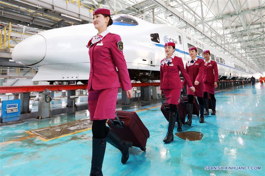 GUIZHOU, enero 16, 2018 (Xinhua) -- Integrantes de la tripulación que sirven para el primer tren que va a comenzar operaciones en la línea ferroviaria Chongqing-Guiyang posan en la Estación del Ferrocarril Guiyan, en Guizhou, en el suroeste de China, el 16 de enero de 2018. La línea ferroviaria Chongqing-Guiyang conecta a Chongqing y Guiyang, dos principales ciudades en el suroeste de China. Dise?ada para trenes de pasajeros con una velocidad máxima de 200 kilómetros por hora, la línea ferroviaria mejorará el tránsito regional. (Xinhua/Liu Xu)
