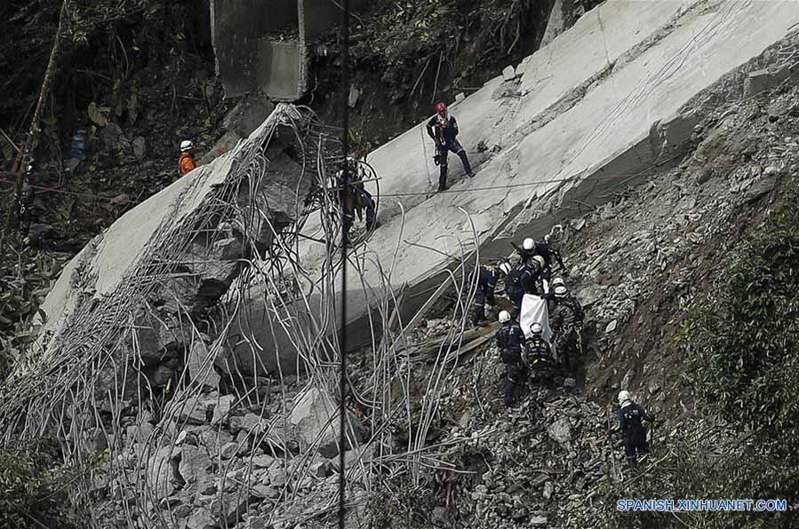 Miembros de los cuerpos de rescate retiran el cuerpo de una víctima del lugar donde se registró el colapso de un puente en el departamento del Meta, Colombia, el 16 de enero de 2018. Al menos 10 muertos y ocho heridos dejó el lunes el desplome de un puente en construcción en la carretera que une las ciudades de Bogotá y Villavicencio. Jorge Díaz, director de la estatal Defensa Civil en el departamento de Meta, afirmó que los trabajadores cayeron de una altura aproximada de 280 metros y en el momento del colapso había sobre la estructura unas 20 personas trabajando. (Xinhua/Jhon Paz)