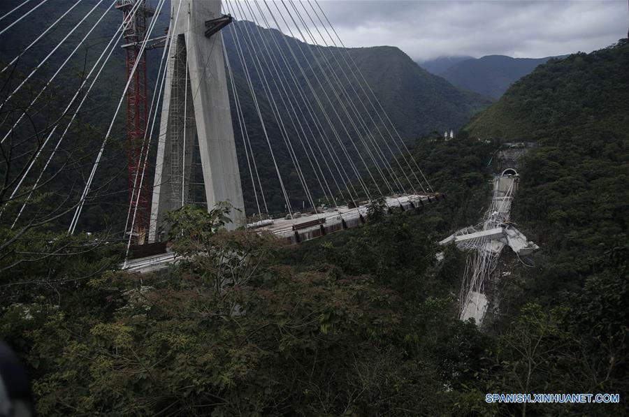 Vista de la estructura del puente colapsado en el departamento del Meta, Colombia, el 16 de enero de 2018. Al menos 10 muertos y ocho heridos dejó el lunes el desplome de un puente en construcción en la carretera que une las ciudades de Bogotá y Villavicencio. Jorge Díaz, director de la estatal Defensa Civil en el departamento de Meta, afirmó que los trabajadores cayeron de una altura aproximada de 280 metros y en el momento del colapso había sobre la estructura unas 20 personas trabajando. (Xinhua/Jhon Paz)