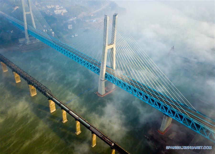 Imagen del 9 de enero de 2018, del nuevo puente ferroviario Baishatuo Río Yangtze (arriba), y del antiguo puente ferroviario Baishatuo Río Yangtze, en Jiangjin, en la municipalidad de Chongqing, en el suroeste de China.(Xinhua/Liu Chan)