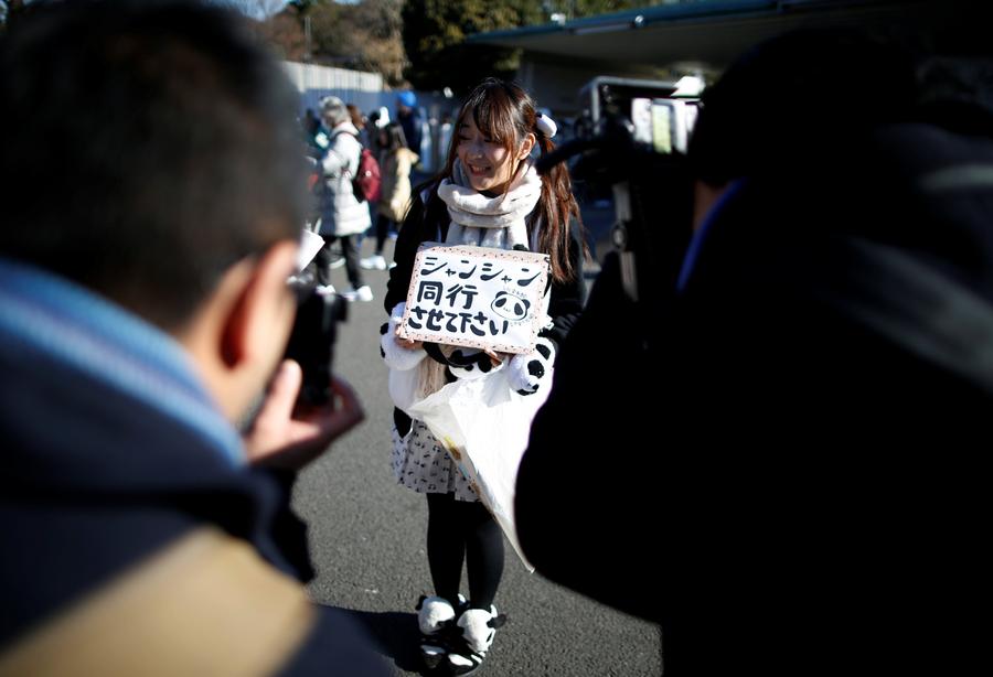 Nishitani Saeko, de 23 a?os, posa con un cartel que dice: “Llévame a conocer a la panda Xiang Xiang”, durante el primer día de su debut público en el Zoológico de Ueno, Tokio, el 19 de diciembre del 2017. [Foto: agencias]