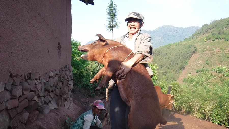 Daddy está pesando un cerdo. [Foto: Wu Liuxiu/Save the Children]