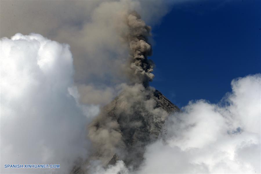 ALBAY, enero 22, 2018 (Xinhua) -- Una columna de humo emena del volcán Mayón, en la provincia de Albay, Filipinas, el 22 de enero de 2018. El Instituto de Vulcanología y Sismología de Filipinas (Phivolcs) elevó el lunes el nivel de alerta por el volcán Mayón del 3 al 4, que significa que una "erupción peligrosa es inminente". (Xinhua/Str)