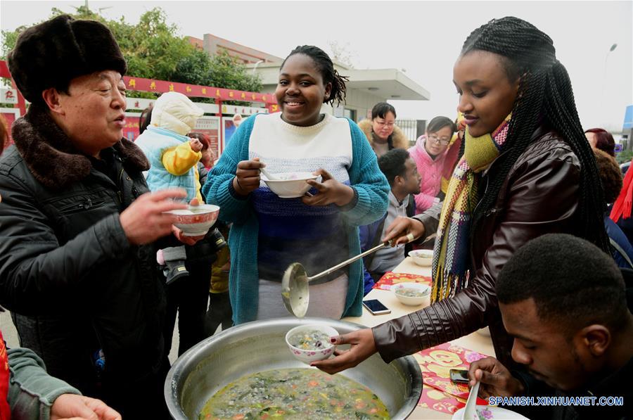 ZHENJIANG, enero 22, 2018 (Xinhua) -- Estudiantes extranjeros de la Universidad de Jiangsu, prueban gachas de laba en Zhenjiang, provincia de Jiangsu, en el este de China, el 22 de enero de 2018. El festival de Laba, es un festival tradicional que se celebra el día 8 del 12 mes lunar, que cae el 24 de enero este a?o. Durante este día se comen las gachas de laba, usualmente hechas con ocho ingredientes, representando las oraciones de la gente para la cosecha. (Xinhua/Shi Yucheng)