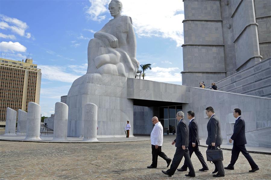 LA HABANA, enero 22, 2018 (Xinhua) -- El enviado especial del secretario general del Comité Central del Partido Comunista de China (PCCh), Xi Jinping, Song Tao (3-d-abajo), también director del Departamento Internacional del Comité Central del PCCh, acompa?ado por el jefe del Departamento de Relaciones Internacionales del Comité Central del Partido Comunista de Cuba (PCC), José Ramón Balaguer (4-d-abajo), caminan frente al monumento a José Martí, en la Plaza de la Revolución, en La Habana, Cuba, el 22 de enero de 2018. Song Tao, enviado especial del secretario general del Comité Central del Partido Comunista de China (PCCh), Xi Jinping, inició el lunes una visita a Cuba donde dialogó con autoridades del Partido Comunista de Cuba (PCC) y realizó otras actividades. (Xinhua/Joaquín Hernández)