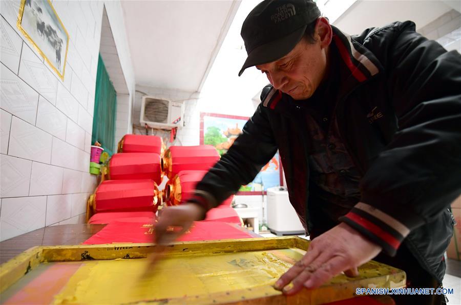 Chen Xi'an imprime caracteres sobre la tela de una linterna, en la villa de Sanzhao del distrito de Yanta en Xi'an, provincia de Shaanxi, en el noroeste de China, el 23 de enero de 2018. Los artesanos del taller de linternas local están atareados elaborando linternas previo al próximo Festival de Primavera. (Xinhua/Shao Rui)
