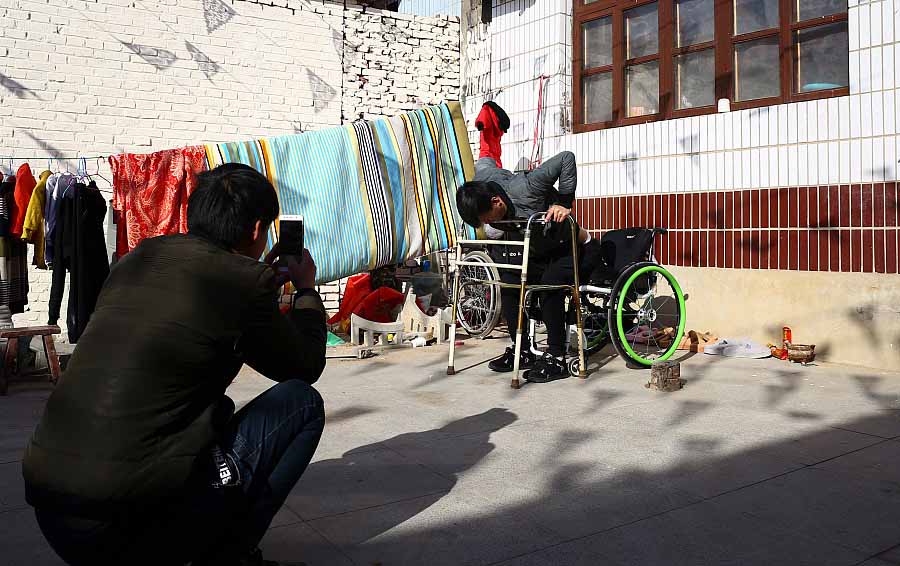 El primo de Hao Panpan graba un video mientras realiza ejercicios de rehabilitación, el 9 de enero de 2018. [Foto / VCG]