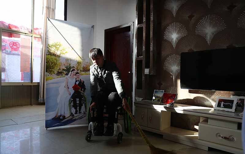 Hao Panpan barre el suelo en su casa, el 9 de enero de 2018. [Foto / VCG]