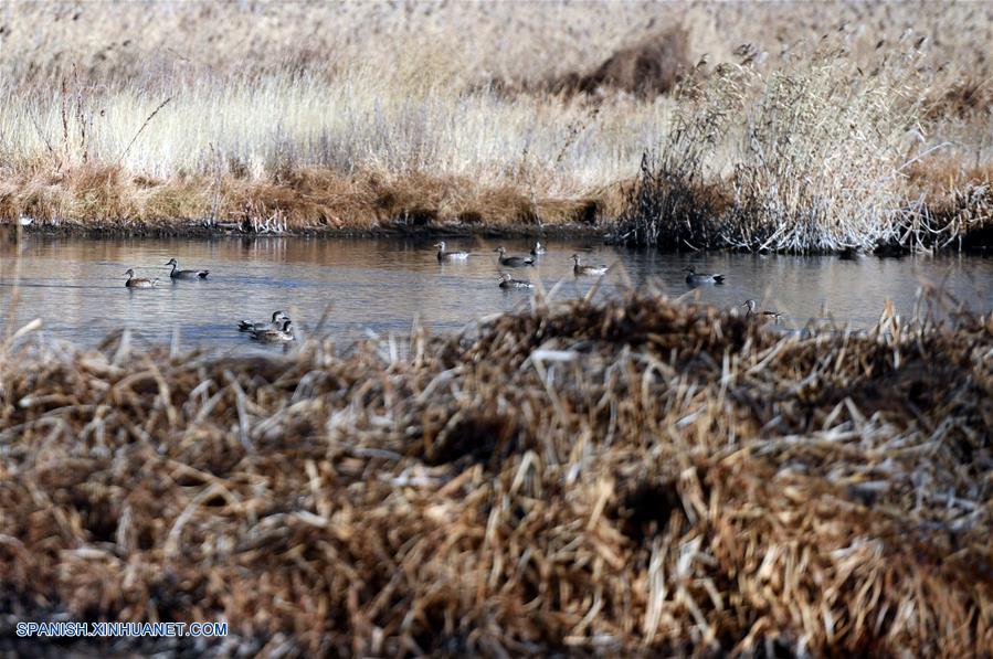 LHASA, noviembre 23, 2017 (Xinhua) -- Aves permanecen en el humedal Lalu, en Lhasa, en la región autónoma del Tíbet, en el suroeste de China, el 23 de noviembre de 2017. La reserva natural nacional del humedal Lalu, con una altitud de aproximadamente 3,600 metros, cubre un área de cerca de 13 kilómetros cuadrados. Más de 5,000 aves de más de 20 especies habitan en la reserva a lo largo del a?o. En el invierno, docenas de especies de aves migratorias vuelan al humedal. (Xinhua/Zhang Rufeng)
