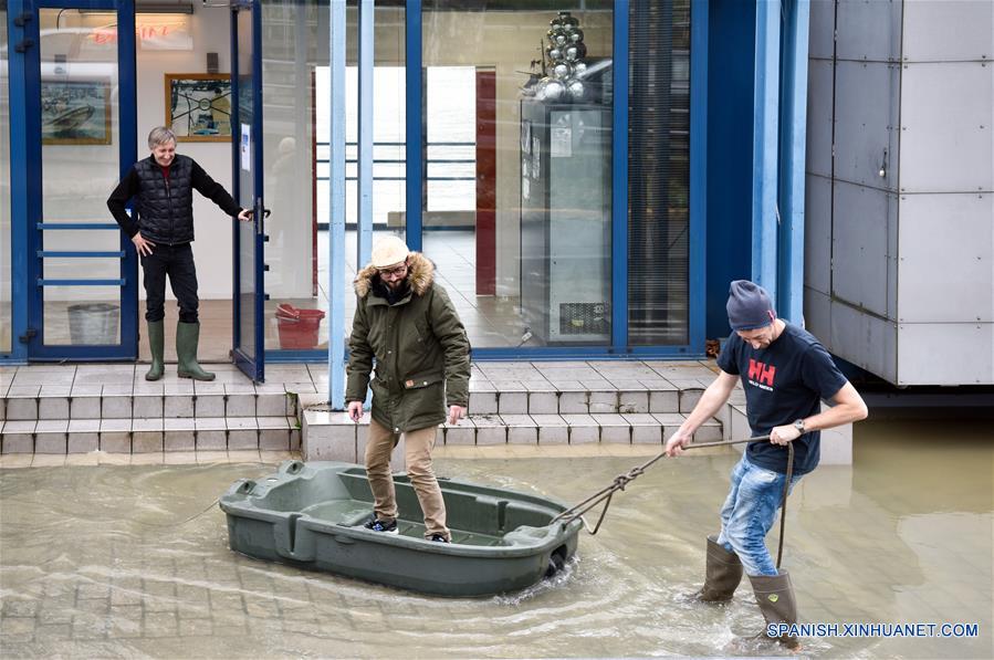 Un hombre vadea en el agua cerca del Río Sena, en París, Francia, el 23 de enero de 2018. La agencia meteorológica francesa Meteo France puso el martes a 23 departamentos en alerta naranja por riesgo de inundaciones. (Xinhua/Chen Yichen)