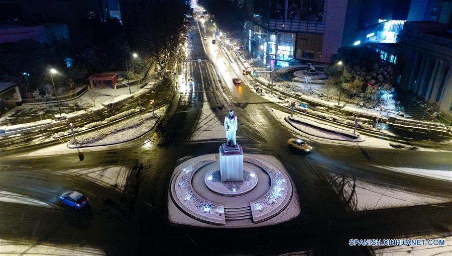 NANJING, enero 25, 2018 (Xinhua) -- Vista de Xinjiekou cubierto de nieve, en Nanjing, capital de la provincia de Jiangsu, en el este de China, el 25 de enero de 2018. El Centro Meteorológico Nacional emitió una alerta amarilla por tormenta de nieve para el miércoles y el jueves, mientras las fuertes nevadas continúan afectando en el centro y el este de China. (Xinhua/Li Xiang)