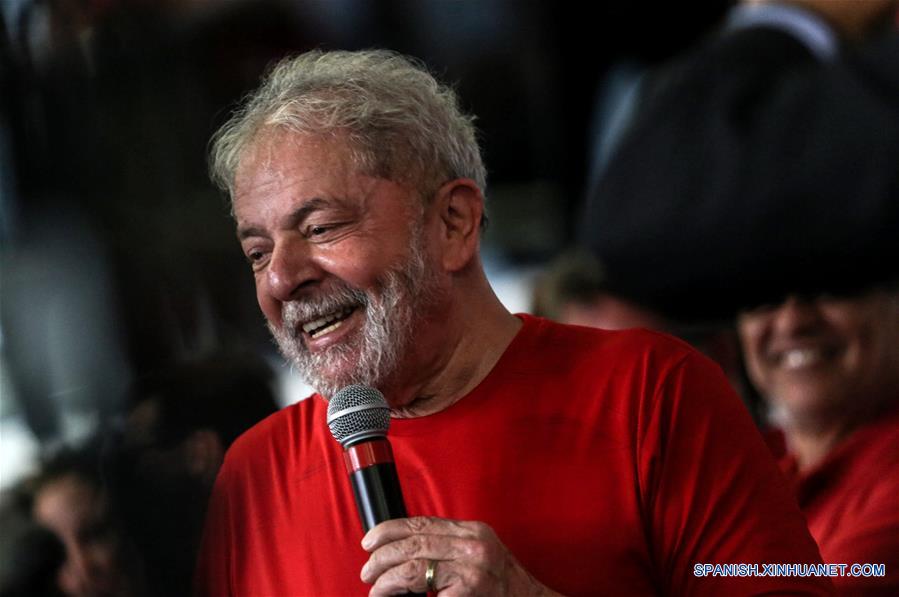 SAO BERNARDO DO CAMPO, enero 24, 2018 (Xinhua) -- El ex presidente de Brasil, Luiz Inácio Lula da Silva, pronuncia un discurso a sus simpatizantes en la sede de la Unión de Trabajadores Metalúrgicos mientras el Tribunal Regional Federal toma una decisión sobre una apelación contra un caso de corrupción que lo imposibilitaría de contender en las elecciones presidenciales de 2018, en Sao Bernardo do Campo, en las afueras de Sao Paulo, Brasil, el 24 de enero de 2018. El Tribunal Regional Federal de la 4a Región (TRF-4), con sede en Porto Alegre en el sur de Brasil, inició el miércoles la sesión en la que debe juzgar el recurso presentado por el ex presidente Luiz Inácio Lula da Silva (2003-2010) contra la condena de nueve a?os y medio de prisión por corrupción pasiva y lavado de dinero que recibió en el marco del caso Petrobras. Tres jueces son los encargados de analizar la apelación presentada por la defensa de Lula, que si es considerado culpable, no podría presentarse a las elecciones generales de octubre próximo, al liderar las intenciones de voto para volver a la presidencia. (Xinhua/Rahel Patrasso)