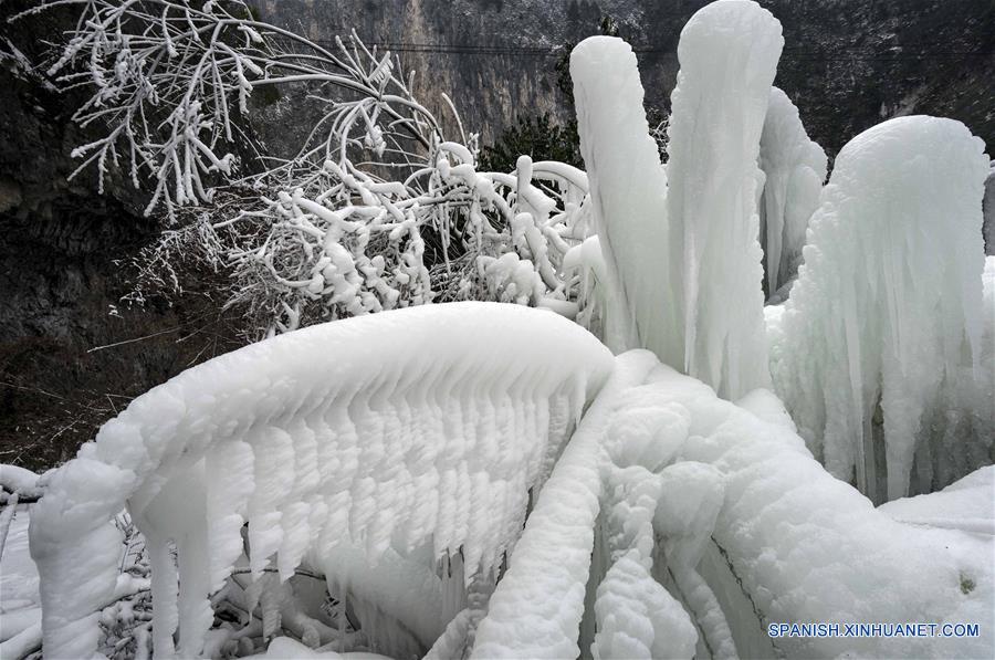 Carámbanos son captados a lo largo de la Autopista Nacional 209 en la villa de Qiaoshang del condado de Fangxian, provincia de Hubei, en el centro de China, el 27 de enero de 2018. (Xinhua/Du Huaju)