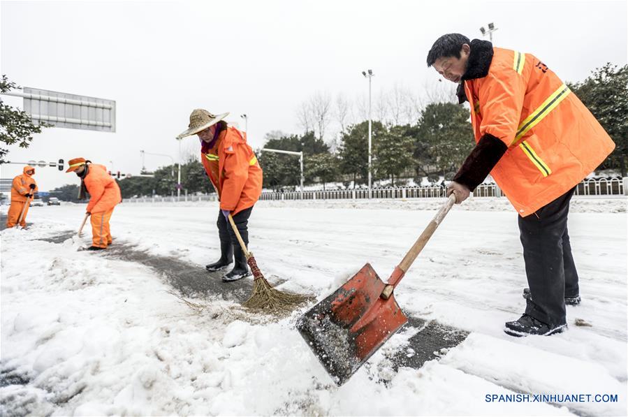 Trabajadores limpian una calle después de una nevada, en la ciudad de Wuhan, capital de la provincia de Hubei, en el centro de China, el 27 de enero de 2018. (Xinhua/Xiong Qi)