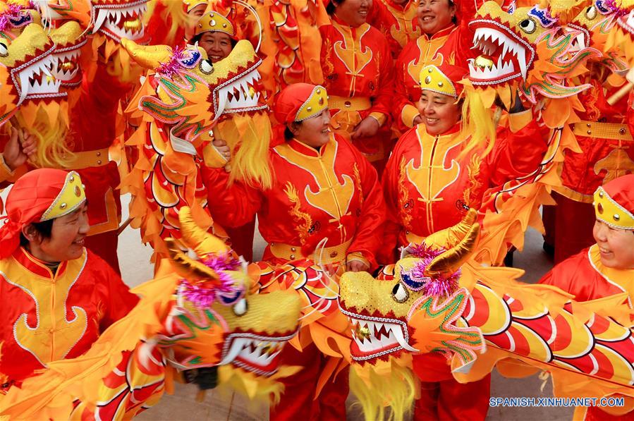 Residentes ensayan una danza de dragón en preparación para celebrar el A?o Nuevo Lunar chino que cae el 16 de febrero este a?o, en la villa de Xiaoxinzhuang del distrito de Huairou en Beijing, capital de China, el 27 de enero de 2018. (Xinhua/Bu Xiangdong)