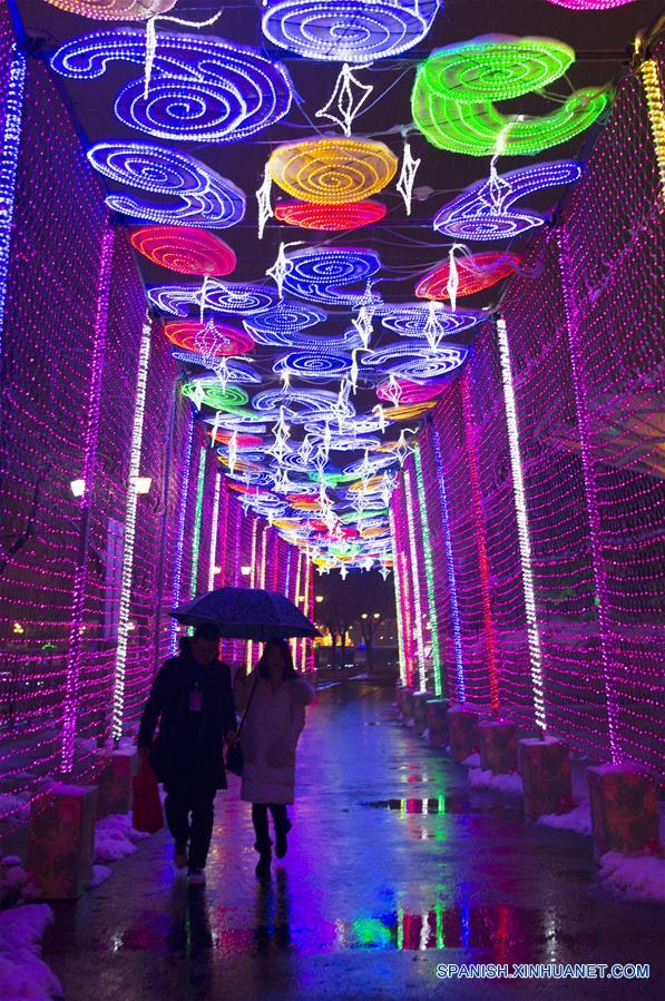 Visitantes recorren el espectáculo de linternas en el parque Nantong Adventure Land, en Nantong, provincia de Jiangsu, en el este de China, el 27 de enero de 2018. El espectáculo de linternas permanecerá hasta marzo de este a?o. (Xinhua/Zhu Haochen)