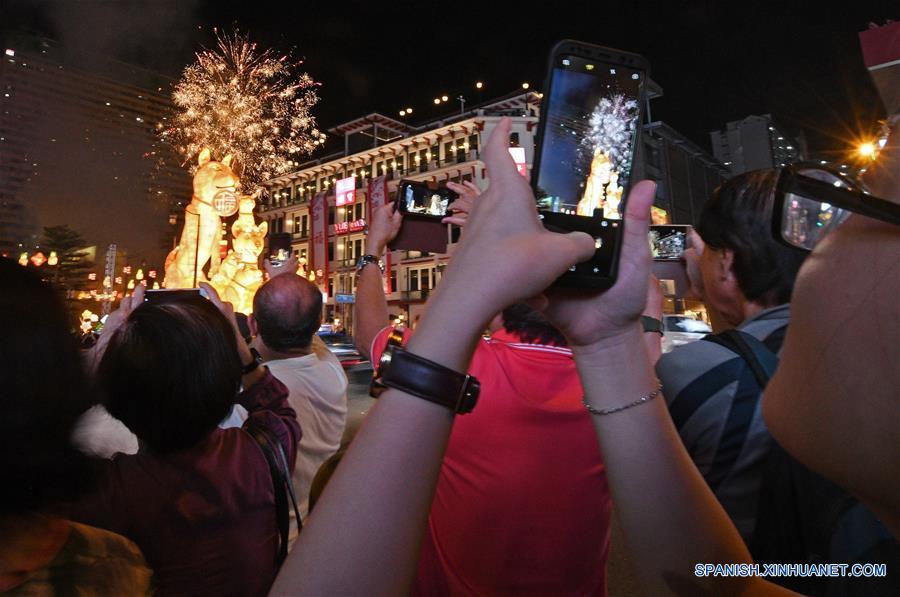 Personas toman fotografías de los fuegos artificiales durante la ceremonia de inauguración llevada a cabo en el Barrio Chino de la ciudad de Singapur, capital de Singapur, el 27 de enero de 2018. Singapur llevó a cabo una ceremonia oficial de iluminación e inauguración en el Barrio Chino para el próximo A?o Nuevo chino. (Xinhua/Then Chih Wey)