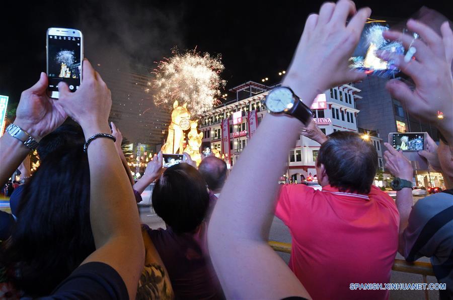 SINGAPUR, enero 27, 2018 (Xinhua) -- Personas toman fotografías de los fuegos artificiales durante la ceremonia de inauguración llevada a cabo en el Barrio Chino de la ciudad de Singapur, capital de Singapur, el 27 de enero de 2018. Singapur llevó a cabo una ceremonia oficial de iluminación e inauguración en el Barrio Chino para el próximo A?o Nuevo chino. (Xinhua/Then Chih Wey)