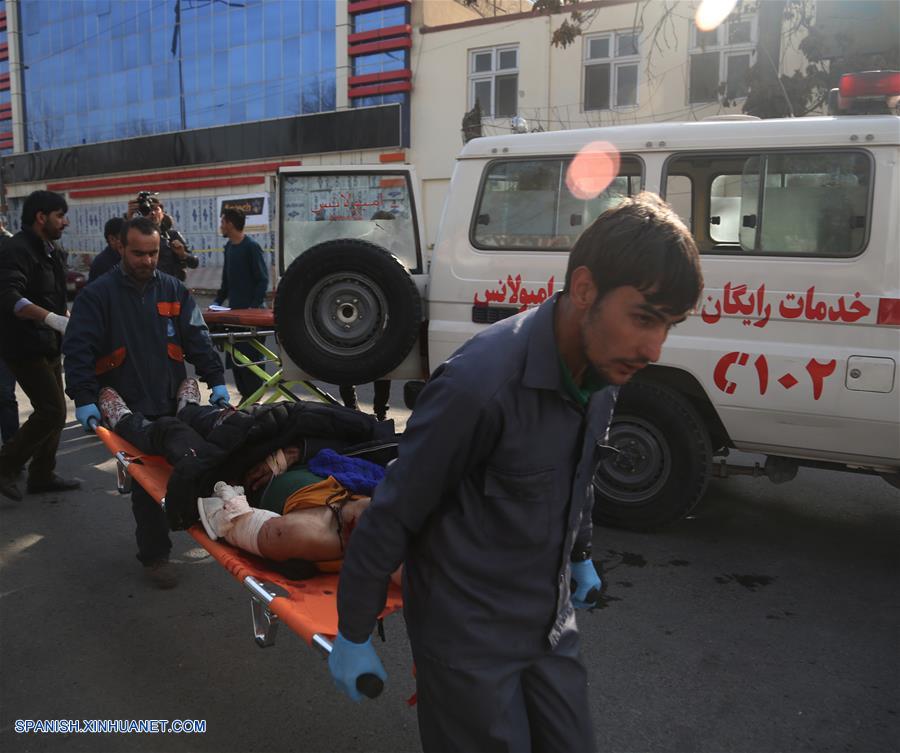 KABUL, enero 27, 2018 (Xinhua) -- Personas trasladan a un hombre herido luego de un atentado suicida en Kabul, Afganistán, el 27 de enero de 2018. El grupo de milicianos talibanes se ha atribuido la responsabilidad del atentado suicida con coche bomba perpetrado este sábado cerca de la plaza Sidarat, en el centro de la capital afgana, Kabul, que dejó 40 personas muertas y 140 heridas. (Xinhua/Rahmat Alizadah)