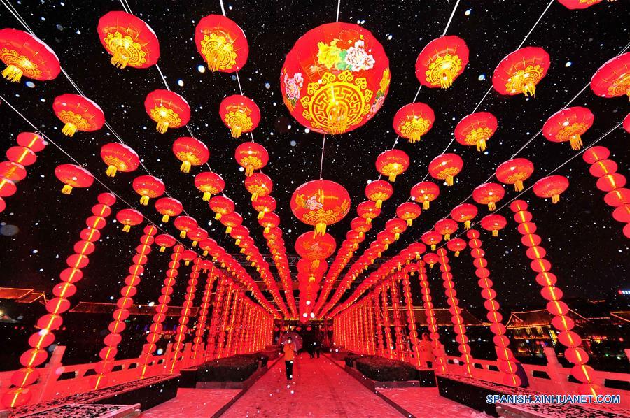 Personas caminan entre linternas sobre una calle en Weifang, en la provincia de Shandong, en el este de China, el 27 de enero de 2018. (Xinhua/Wang Jilin)