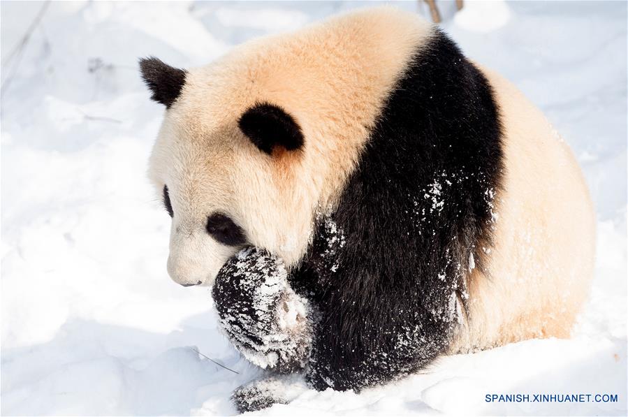 Un panda gigante juega con la nieve en el Zoológico Forestal Hongshan, en Nanjing, capital de la provincia de Jiangsu, en el este de China, el 29 de enero de 2018. (Xinhua/Su Yang)