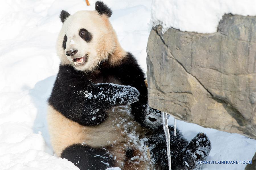 Un panda gigante juega con la nieve en el Zoológico Forestal Hongshan, en Nanjing, capital de la provincia de Jiangsu, en el este de China, el 29 de enero de 2018. (Xinhua/Su Yang)