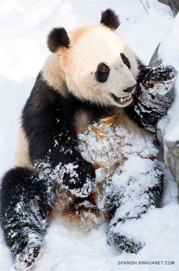 Un panda gigante juega con la nieve en el Zoológico Forestal Hongshan, en Nanjing, capital de la provincia de Jiangsu, en el este de China, el 29 de enero de 2018. (Xinhua/Su Yang)