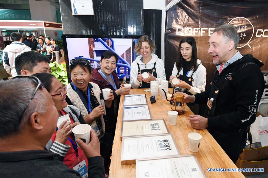 Un participante muestra las habilidades para preprar café durante la 1 Expo Internacional de Café Especial Pu'er en la ciudad de Pu'er, en la provincia de Yunnan, en el suroeste de China, el 29 de enero de 2018. De acuerdo con información de la prensa local, la expo de 3 días comenzó el lunes en Pu'er, con 30 expertos en café y más de 200 empresas locales e invitados extranjeros. (Xinhua/Yang Zongyou)
