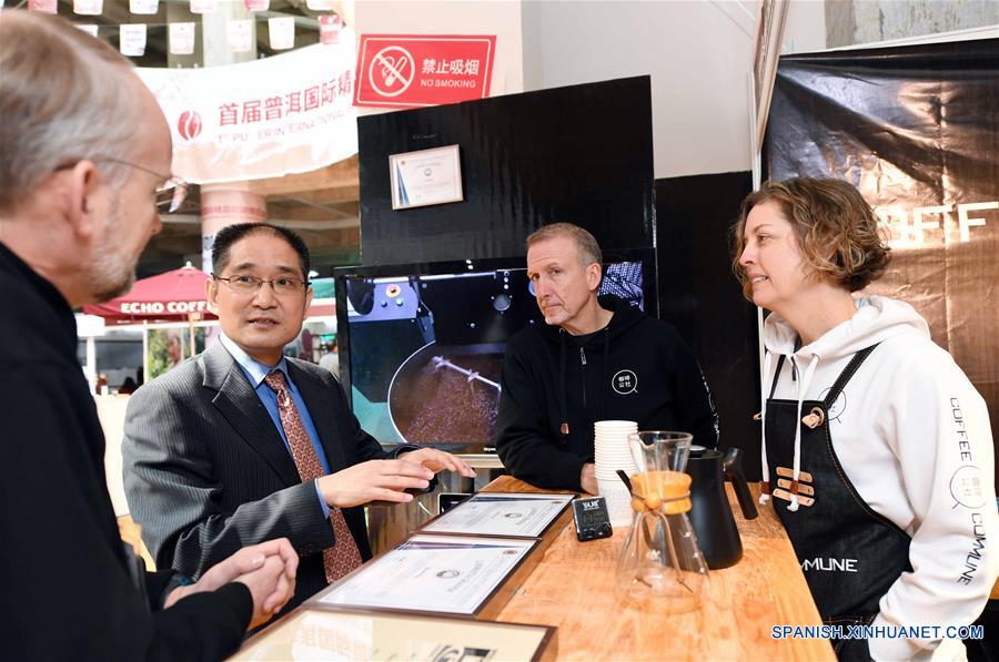 Participantes conversan durante la 1 Expo Internacional de Café Especial Pu'er en la ciudad de Pu'er, en la provincia de Yunnan, en el suroeste de China, el 29 de enero de 2018. De acuerdo con información de la prensa local, la expo de 3 días comenzó el lunes en Pu'er, con 30 expertos en café y más de 200 empresas locales e invitados extranjeros. (Xinhua/Yang Zongyou)