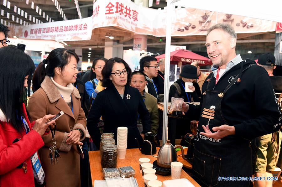 YUNNAN, enero 29, 2018 (Xinhua) -- Un participante muestra las habilidades para preprar café durante la 1 Expo Internacional de Café Especial Pu'er en la ciudad de Pu'er, en la provincia de Yunnan, en el suroeste de China, el 29 de enero de 2018. De acuerdo con información de la prensa local, la expo de 3 días comenzó el lunes en Pu'er, con 30 expertos en café y más de 200 empresas locales e invitados extranjeros. (Xinhua/Yang Zongyou)