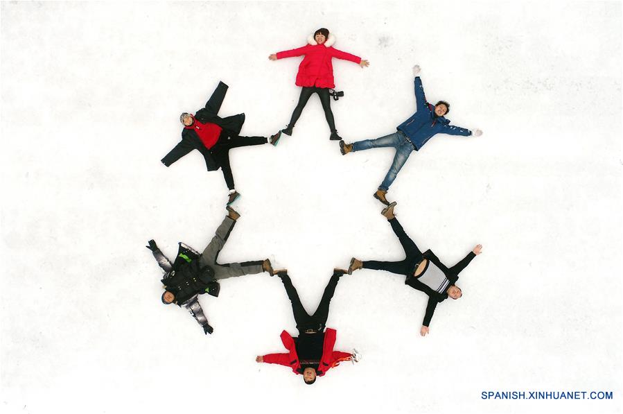 HUNAN, enero 30, 2018 (Xinhua) -- Imagen del 29 de enero de 2018 de personas posando para las fotografías creativas después de una nevada, en el condado de Guiyang de Chenzhou, provincia de Hunan, en el centro de China. (Xinhua/Str)