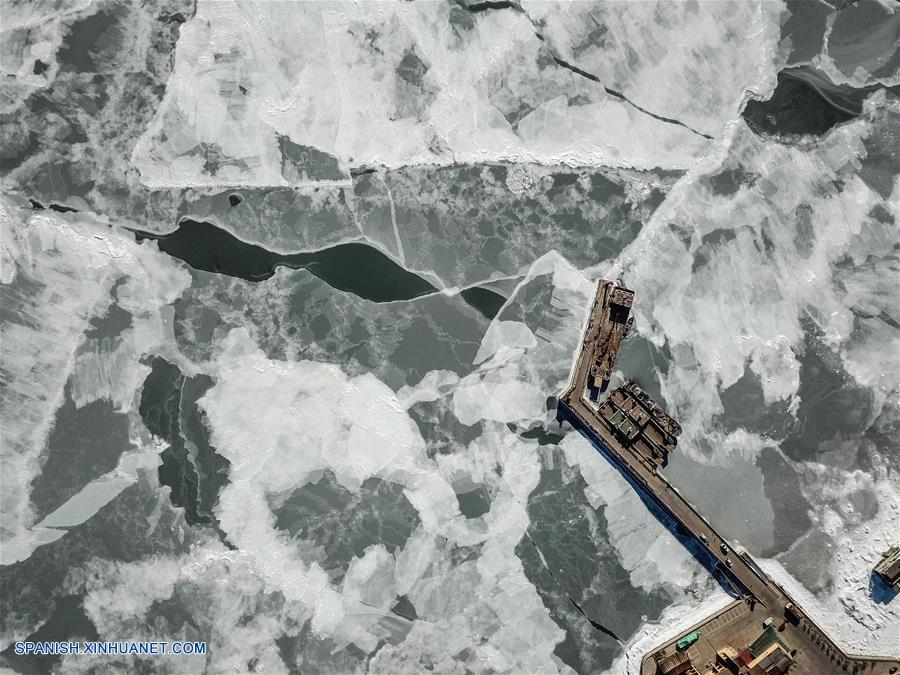 LIAONING, enero 29, 2018 (Xinhua) -- Botes pesqueros permanecen sobre el hielo marino en las aguas circundantes de la ciudad de Xingcheng, en la provincia de Liaoning, en el noreste de China, el 29 de enero de 2018. El hielo marino se formó en la región debido a la baja temperatura continua. (Xinhua/Pan Yulong)