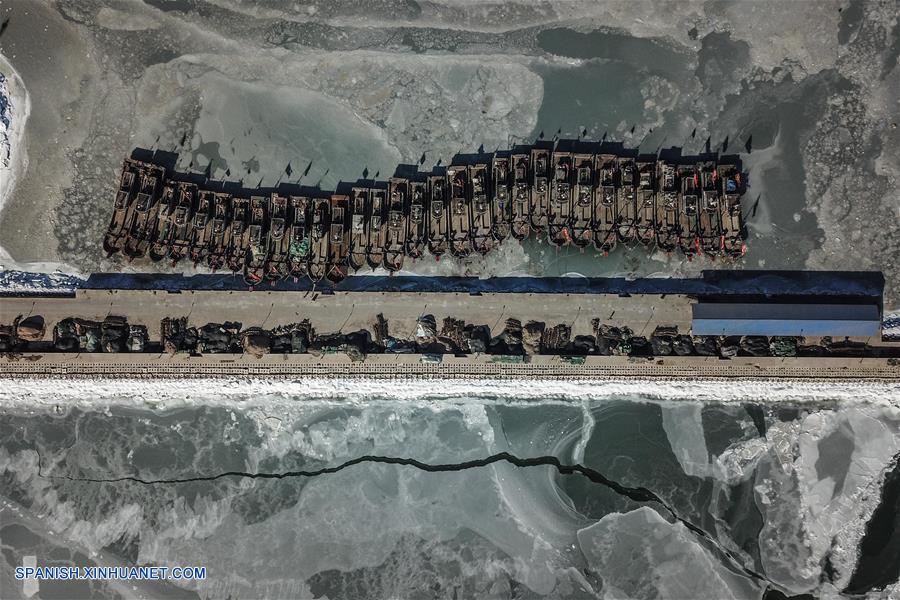 LIAONING, enero 29, 2018 (Xinhua) -- Botes pesqueros permanecen sobre el hielo marino en las aguas circundantes de la ciudad de Xingcheng, en la provincia de Liaoning, en el noreste de China, el 29 de enero de 2018. El hielo marino se formó en la región debido a la baja temperatura continua. (Xinhua/Pan Yulong)