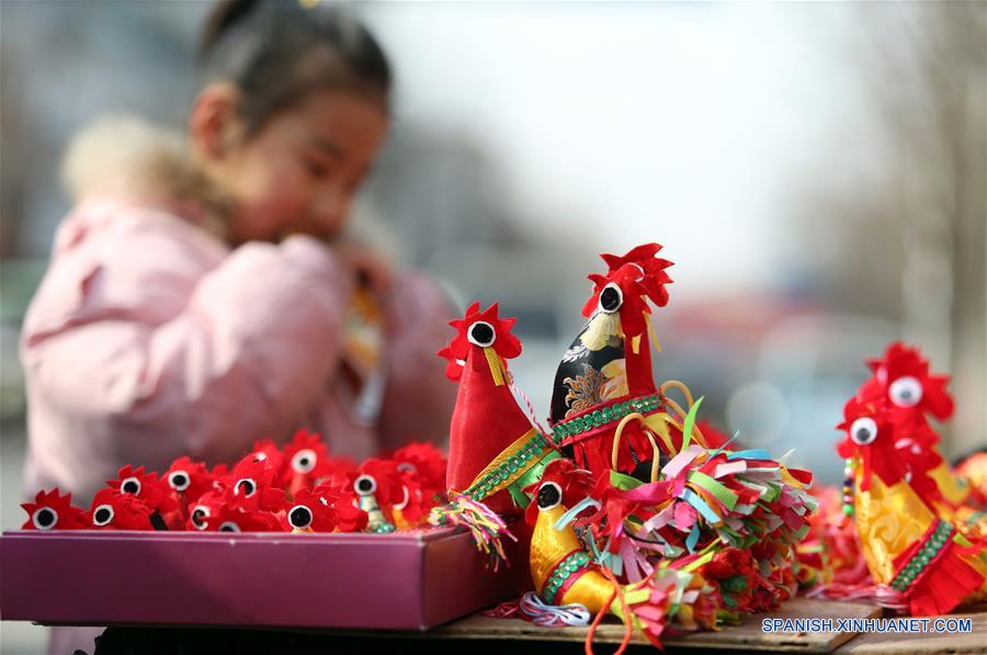 SHANDONG, enero 30, 2018 (Xinhua) -- "Gallos de primavera" hechos de tela de algodón de colores son exhibidos en una calle del condado de Tancheng, provincia de Shandong, en el este de China, el 30 de enero de 2018. Con el acercamiento del Lichun, o Comienzo de la Primavera, el primer periodo solar del calendario lunar chino, los "gallos de primavera" de colores son vendidos en las villas del sur de Shandong, que se espera traiga buena suerte para los ni?os en un a?o nuevo. (Xinhua/Zhang Chunlei)