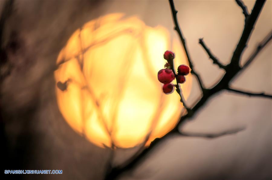 ZHEJIANG, enero 30, 2018 (Xinhua) -- Imagen del 29 de enero de 2018 de una vista de capullos de flor de ciruelo en la orilla del Lago Dongqian, en la ciudad de Ningbo, provincia de Zhejiang, en el este de China. (Xinhua/Yin Fujun)