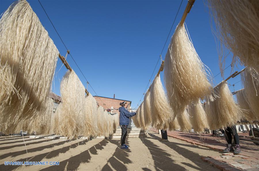 HEBEI, enero 30, 2018 (Xinhua) -- Residentes secan fideos vermicelli, en la villa de Zhongtan del municipio de Ping'ancheng, provincia de Hebei, en el norte de China, el 30 de enero de 2018. Los residentes han estado atareados secando fideos vermicelli para hacer frente a la demanda del mercado. (Xinhua/Liu Mancang)