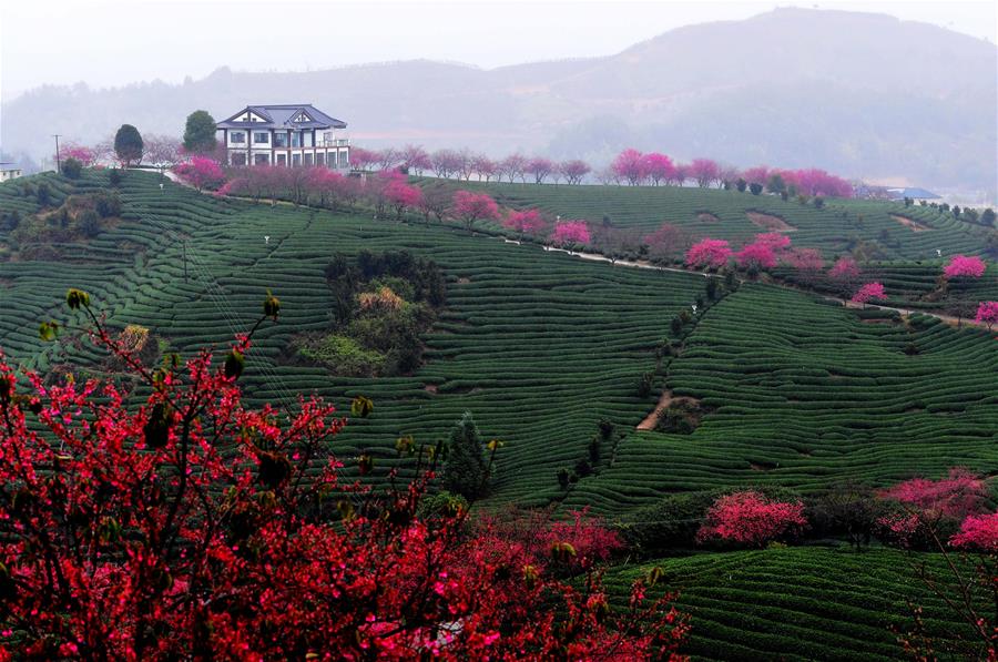 FUJIAN, enero 31, 2018 (Xinhua) -- Vista de las flores de cerezo en un jardín de té, en el municipio de Yongfu de la ciudad de Zhangping, provincia de Fujian, en el sureste de China, el 31 de enero de 2018. Las flores de cerezo de Yongfu atraen a un gran número de turistas en la temporada de floración de enero a marzo cada a?o. (Xinhua/Wei Peiquan)