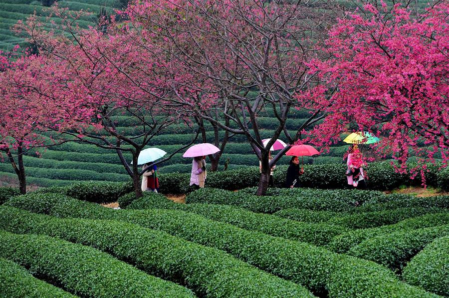 FUJIAN, enero 31, 2018 (Xinhua) -- Turistas observan las flores de cerezo en un jardín de té, en el municipio de Yongfu de la ciudad de Zhangping, provincia de Fujian, en el sureste de China, el 31 de enero de 2018. Las flores de cerezo de Yongfu atraen a un gran número de turistas en la temporada de floración de enero a marzo cada a?o. (Xinhua/Wei Peiquan)