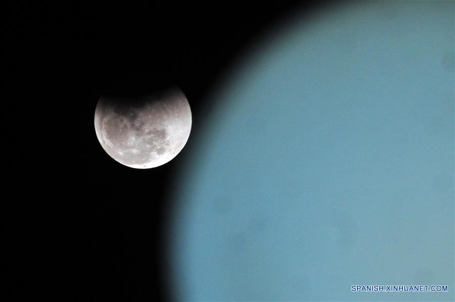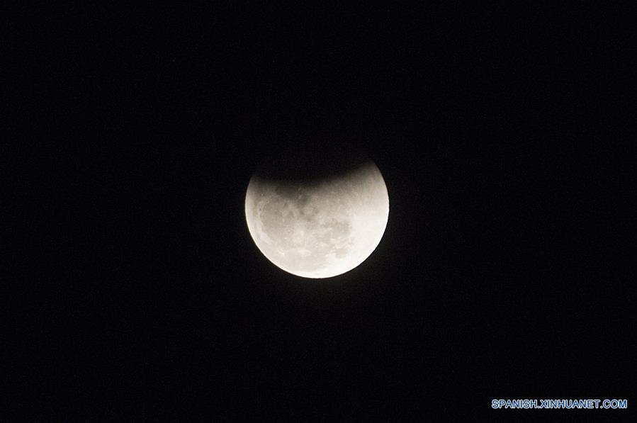 SRINAGAR, enero 31, 2018 (Xinhua) -- Vista de la luna en el cielo durante un eclipse lunar total, en la ciudad de Srinagar, capital de verano de Cachemira administrada parcialmente por India, el 31 de enero de 2018. (Xinhua/Javed Dar)