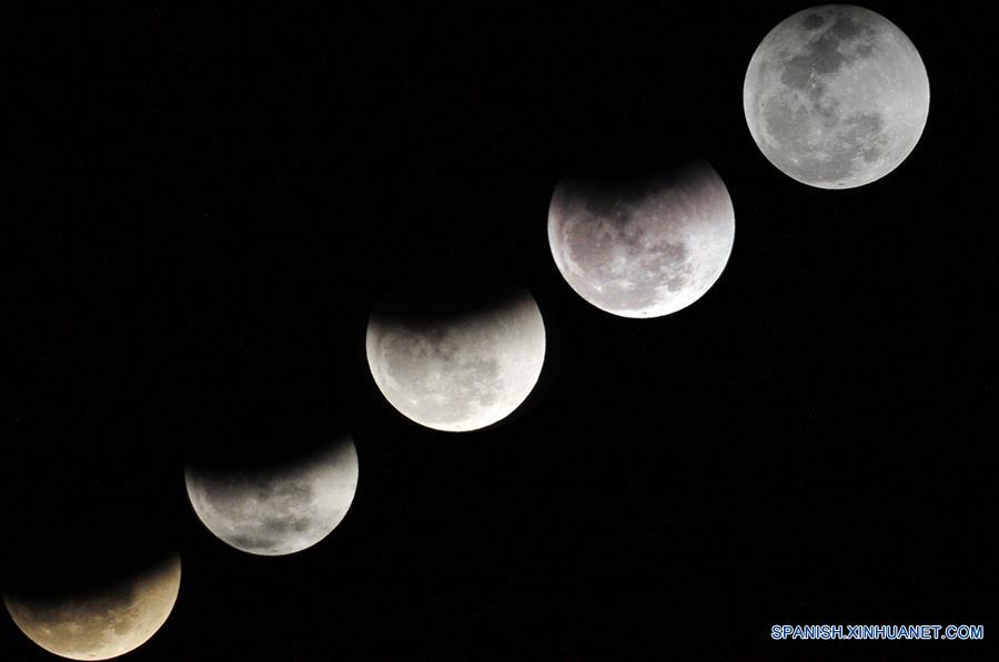 GWADAR, enero 31, 2018 (Xinhua) -- Imagen combinada de una vista de las diferentes siluetas de la luna durante un eclipse lunar total, en Gwadar, en el suroeste de Pakistán, el 31 de enero de 2018. (Xinhua/Ahmad Kamal)