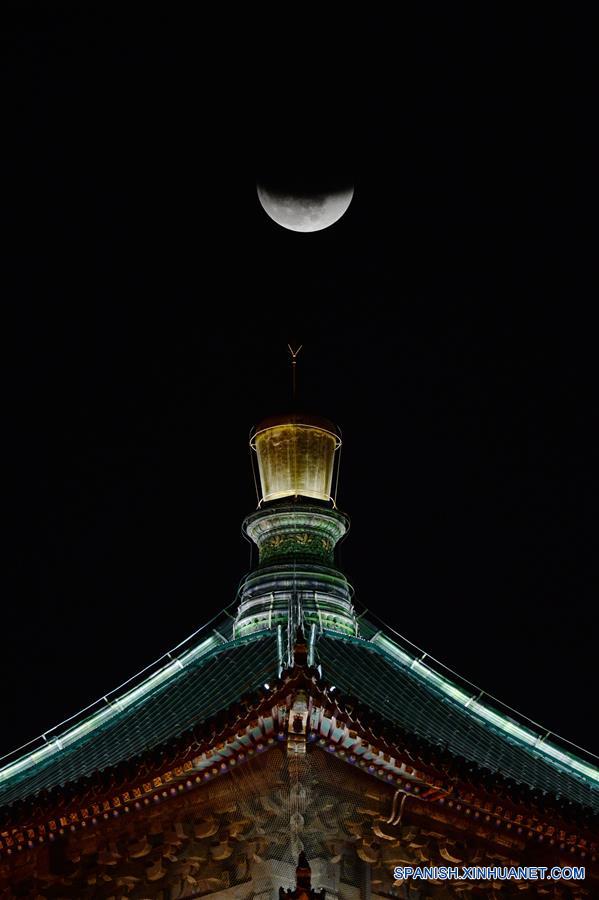 SHAANXI, enero 31, 2018 (Xinhua) -- La Luna se eleva sobre una torre del reloj en Xi'an, en la provincia de Shaanxi, en el noroeste de China, el 31 de enero de 2018. La personas alrededor de China observaron en el cielo la rara Superluna azul de sangre el miércoles por la noche. (Xinhua/Li Yibo)